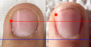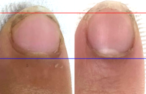 ビフォー時(左)の爪床先端の部分が右の画像では伸びて広がっているのがわかります。